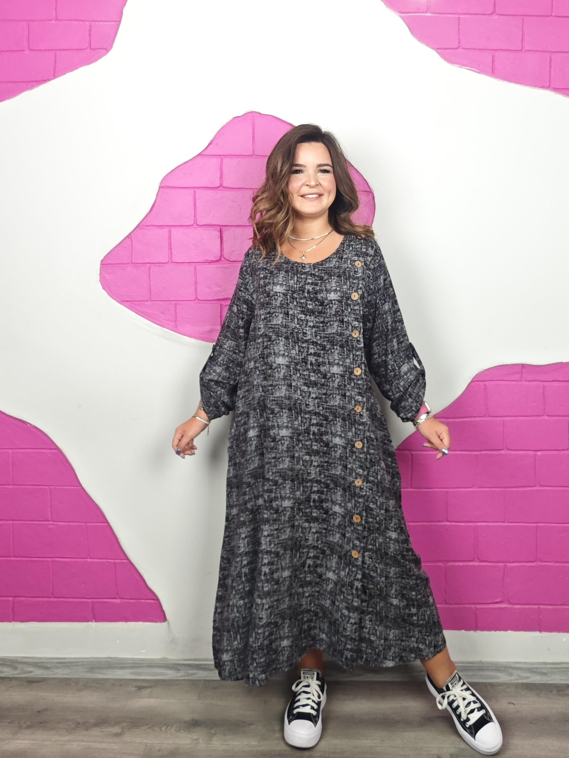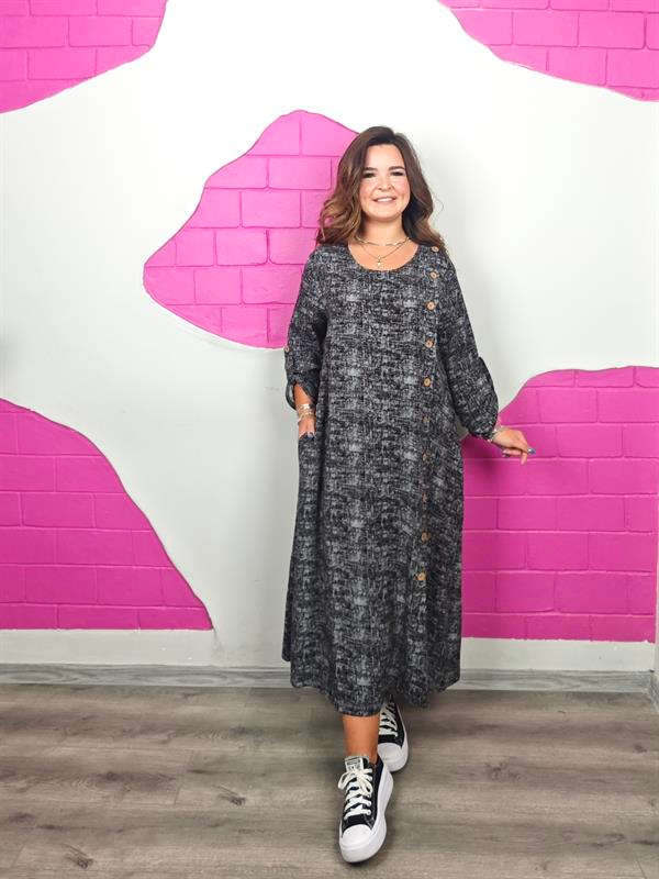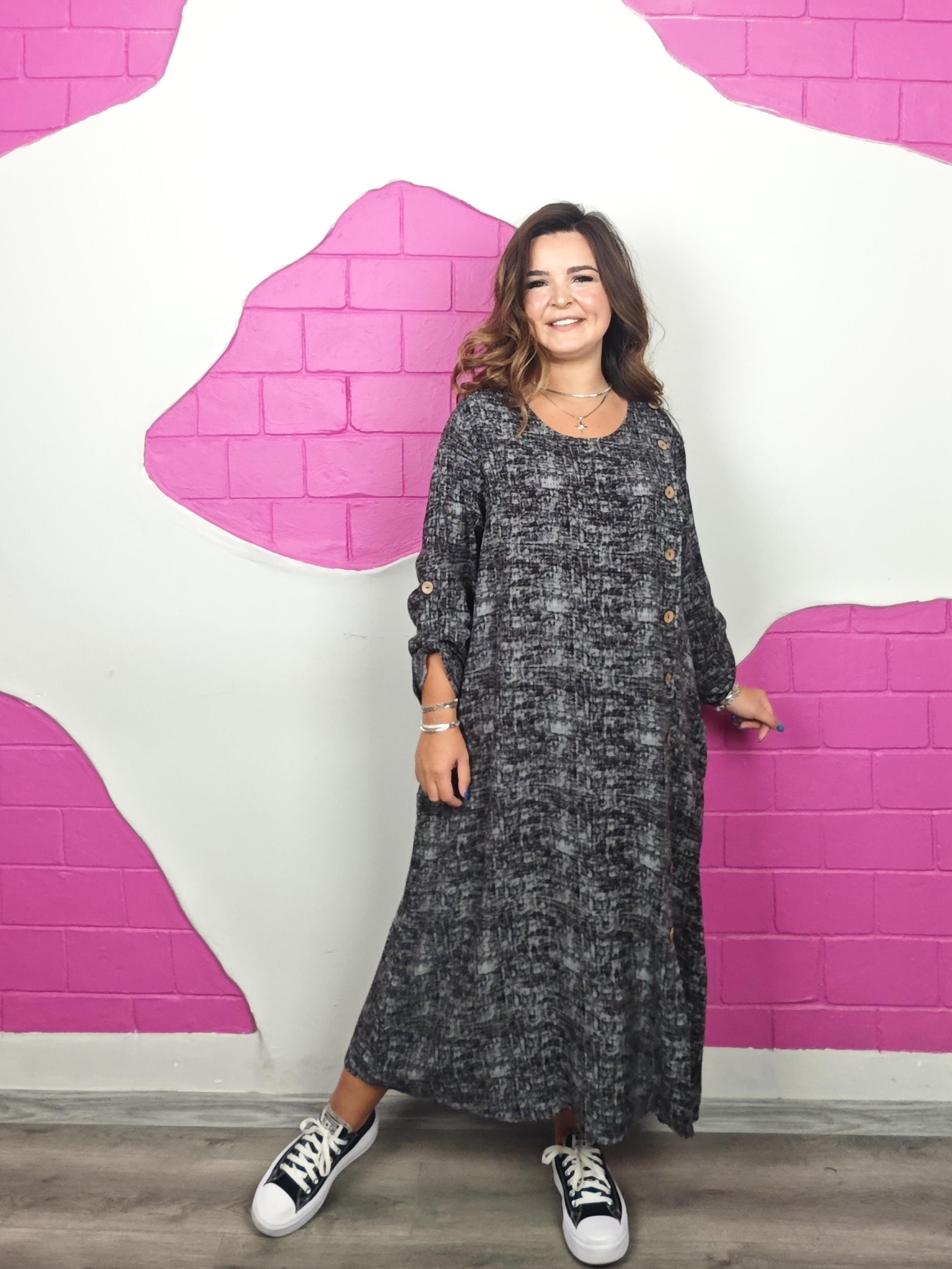 BÜYÜK BEDEN GRİ DÜĞMELİ VİSKON ELBİSE ÖN SİPARİŞE AÇIK 24 EYLÜL KARGO