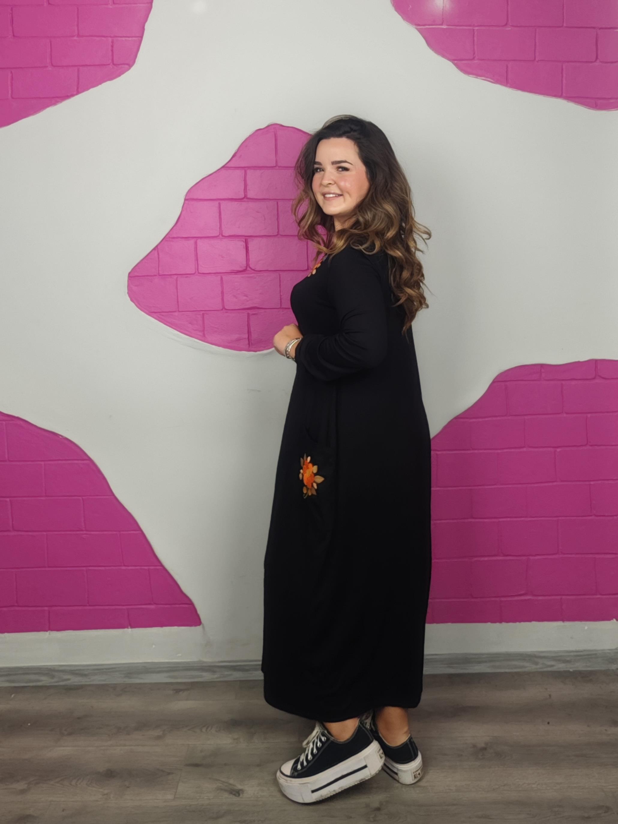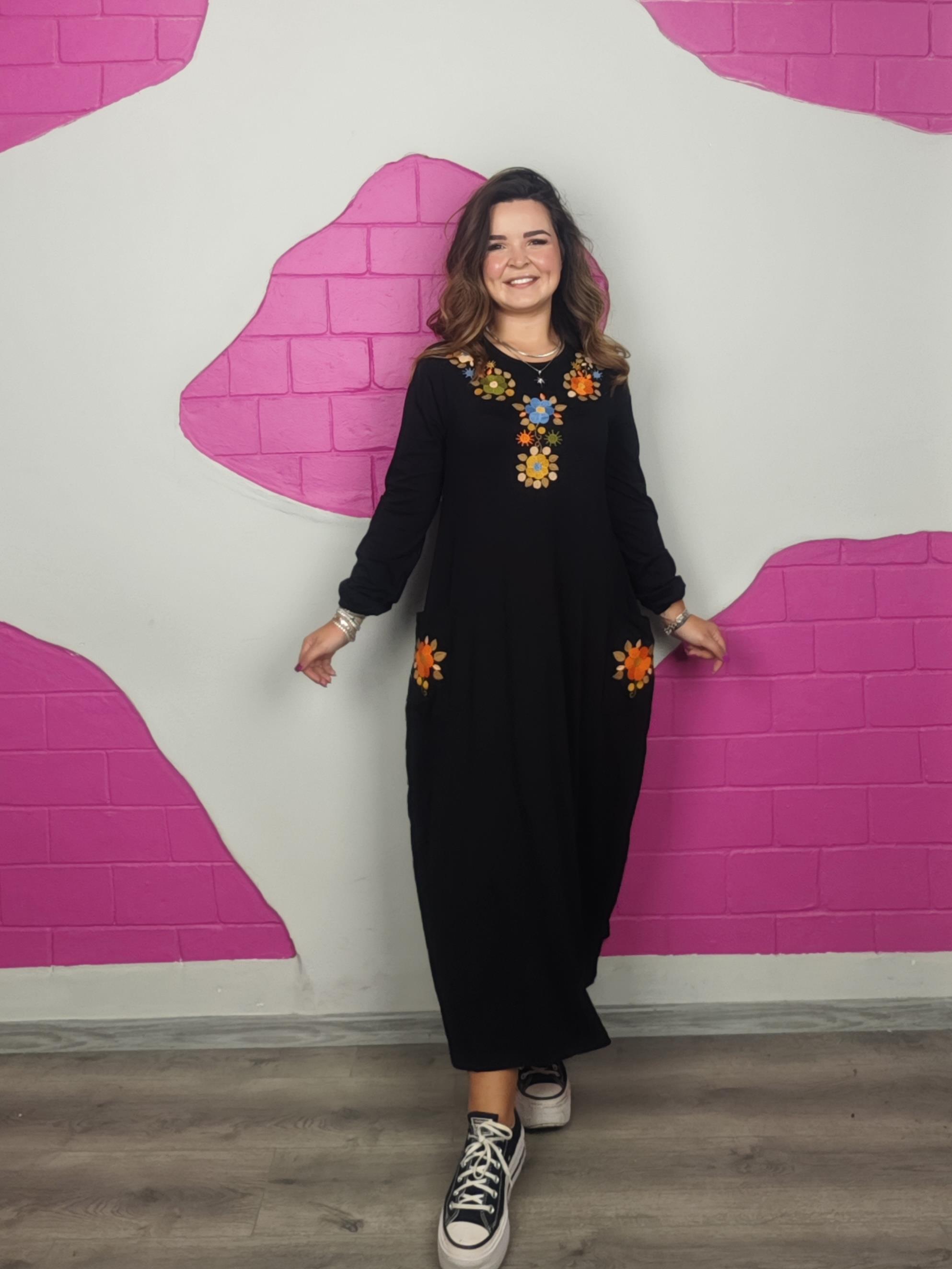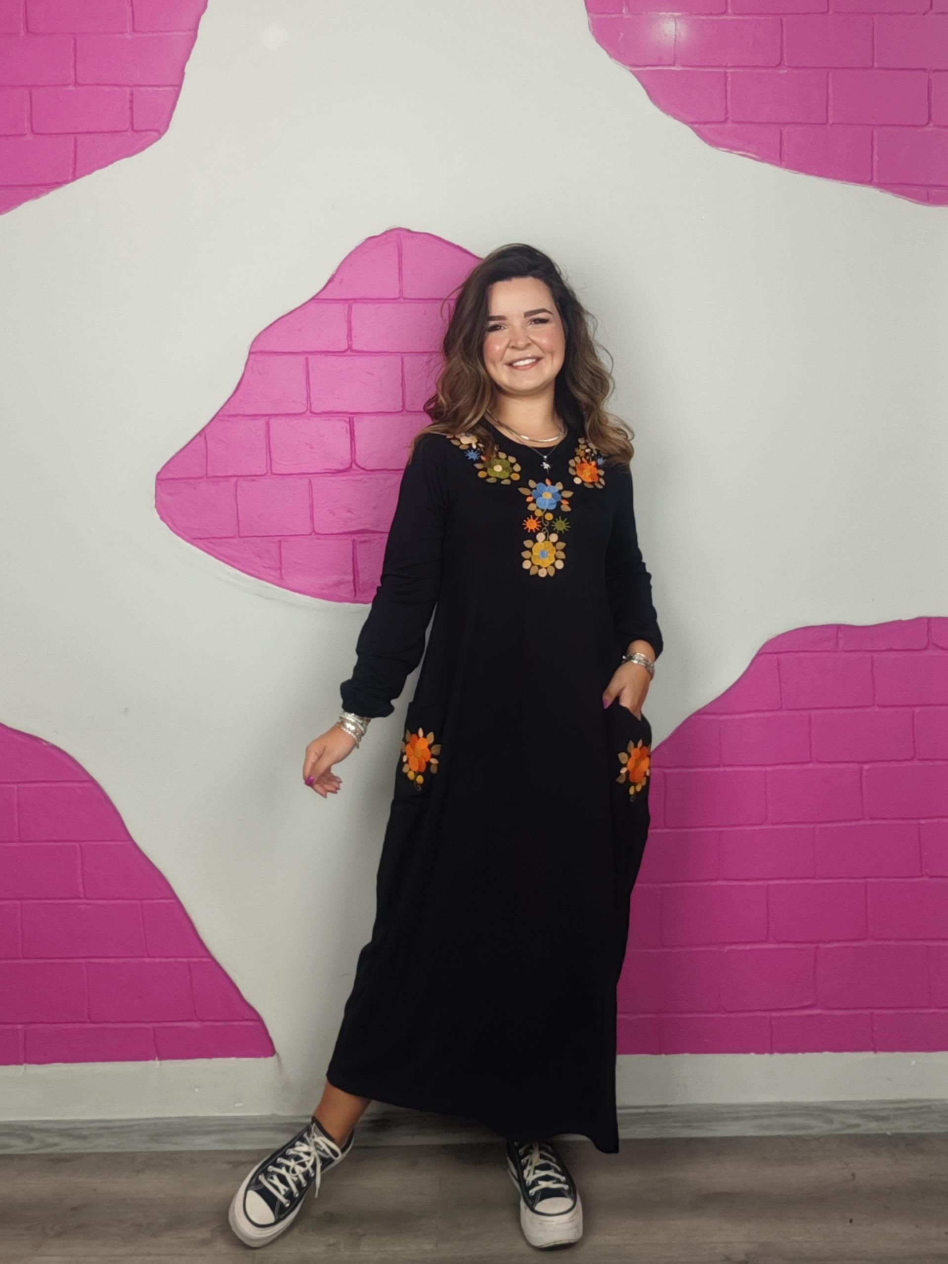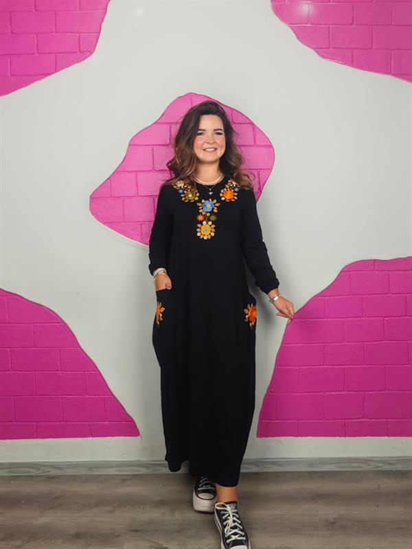 BÜYÜK BEDEN UZUN KOL ÇİÇEK NAKIŞLI ELBİSE 130CM BOY